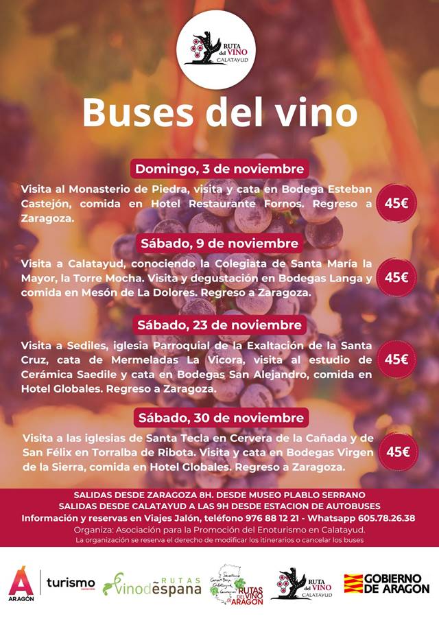 Las excursiones en autobús permitirán a los participantes disfrutar de la riqueza enológica y patrimonial de Calatayud. Cuatro salidas están previstas, cada una con un recorrido diferente. El domingo 3 de noviembre se visitará el Monasterio de Piedra, un importante destino turístico de Aragón, que además alberga el Museo del Vino de la D.O. Calatayud. Después, se realizará una cata en Bodega Esteban Castejón y se finalizará con una comida en el Hotel Restaurante Fornos. El coste de la excursión es de 45 euros, con salida desde Zaragoza y Calatayud.