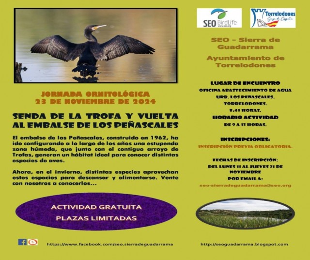 Este evento,organizado de forma conjunta entre la Concejalía de Turismo de Torrelodones y SEO – Sierra de Guadarrama, es una oportunidad única para conocer de cerca la rica biodiversidad de este espacio natural. La actividad incluirá un recorrido a lo largo de la senda de Arroyo de Trofas y alrededor del embalse de los Peñascales, una zona conocida por albergar especies animales, sobre todo aves de gran variedad.