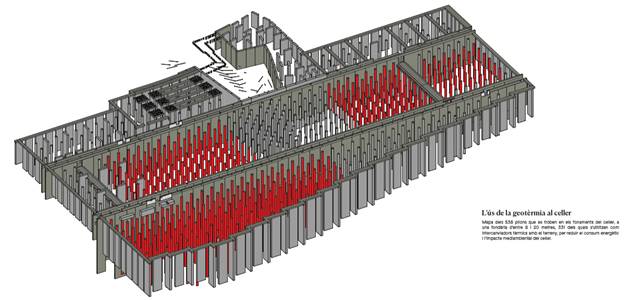 El edificio cuenta con 1.000 metros cuadrados de paneles solares capaces de generar el 20% de su energía eléctrica. Además, se ha diseñado para maximizar el aprovechamiento de la luz natural y minimizar el consumo energético gracias a un sistema de aislamiento térmico avanzado y la utilización de tecnologías como la aerotermia y la geotermia. Este último sistema, con 331 de 538 pilotos geotérmicos operativos, permite un ahorro del 37% en calefacción, refrigeración y agua caliente. Por otro lado, el diseño funcional en dos niveles facilita el uso de la gravedad para las operaciones de vinificación, reduciendo el consumo energético necesario para el bombeo mecánico.