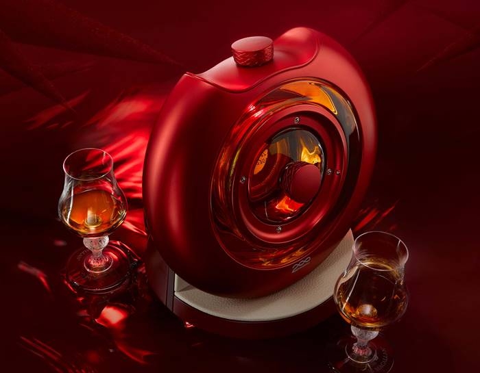 La botella Time: Space es una pieza única no solo por su contenido, sino también por su presentación. Inspirada en una máquina del tiempo, se ha diseñado con un sistema de doble cámara para alojar los dos líquidos, permitiendo destacar sus colores 100% naturales. El decantador, de diseño futurista, está envuelto en una estructura escultórica de madera de roble europeo y americano con 200 picos, que simbolizan los 200 años de historia de la marca y la protección de la naturaleza.