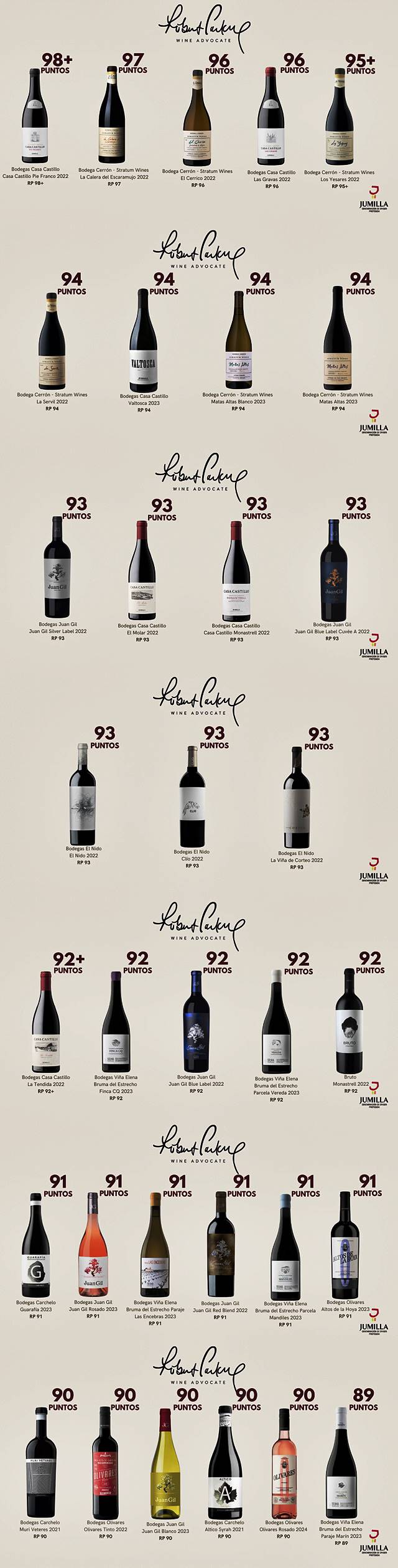 La DOP Jumilla también ha recibido elogios por la diversidad de bodegas y estilos. Bodegas Juan Gil y Bodegas El Nido figuran con puntuaciones entre los 91 y 93 puntos, con vinos como Clío, El Nido y Juan Gil Cuvée A, que continúan siendo referentes de la región. Juan Gil Plata 2022, con 93 puntos, fue alabado por su frescura y su equilibrio, características logradas pese a un clima cálido y seco. El crítico lo calificó como una "ganga" por su relación calidad-precio.