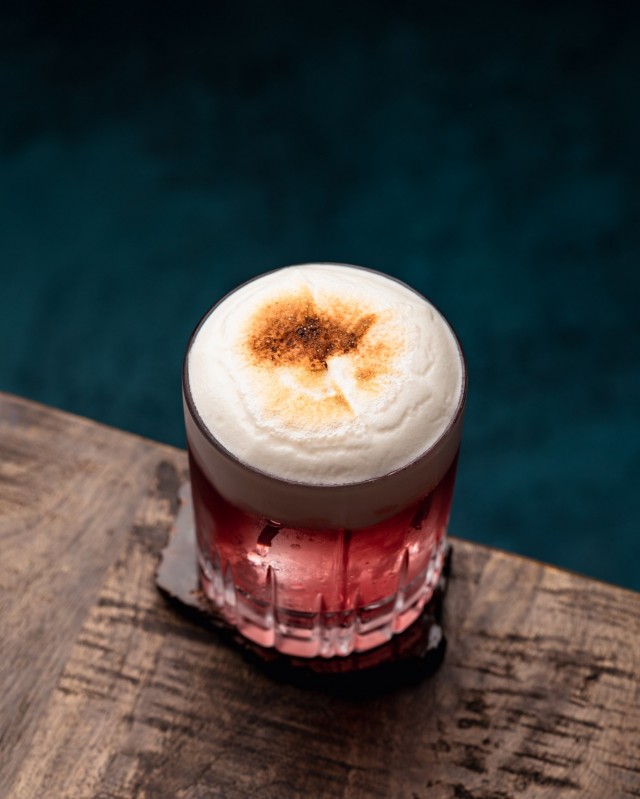 Introducir todos los ingredientes en una coctelera y agitar con hielo. Posteriormente, realizar un segundo batido en seco y colar dos veces. Por último, decorar con una espuma de clara de huevo y flamear ligeramente.