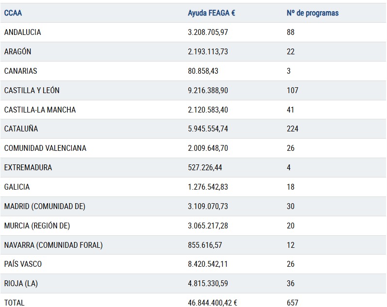 El reparto de los fondos se ha distribuido entre las distintas comunidades autónomas en función del número de programas presentados. Castilla y León es la que más fondos recibirá, con 9,2 millones de euros para 107 programas, seguida del País Vasco, con 8,4 millones y 26 programas, y Cataluña, con 5,9 millones y 224 programas. La Rioja, Andalucía, la Comunidad de Madrid y la Región de Murcia también han recibido importantes cantidades para la promoción de sus vinos en el exterior.
