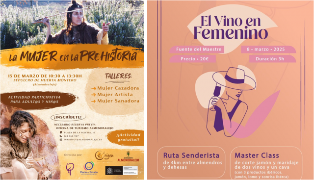 El próximo 8 de marzo se celebrará 'El vino en femenino'un acto que tendrá como punto de encuentro Fuente del Mestre, a las 10:00. Desde allí se iniciará una ruta senderista de 4km entre almendros en flor, viñedos y olivares guiada por Marta Muñoz, agricultora y ganadera, y terminando en la dehesa. Para finalizar recibiréis una master class de corte de jamón y una cata maridaje de dos vinos y un cava armonizados con tres productos ibéricos (jamón, lomo y sonrisa ibérica) con Juan Miguel Zambrano, CEO de Arizar Selecto. Por un precio de 20 euros con 3 horas de duración aproximada.