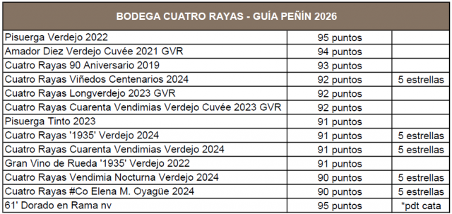 Las elaboraciones de Bodega Cuatro Rayas -cooperativa vitivinícola de la DO Rueda que aglutina los viñedos de 300 socios y socias de las provincias de Valladolid y Segovia- han obtenido un lugar destacado entre las puntuaciones de la prestigiosa Guía Peñín en su edición 2026, en la que trece elaboraciones de Cuatro Rayas han obtenido puntuaciones iguales o superiores a los 90 puntos. Cinco de ellas, además, han recibido un reconocimiento especial a su relación calidad-precio y aparecen reflejadas como vinos con 5 estrellas.