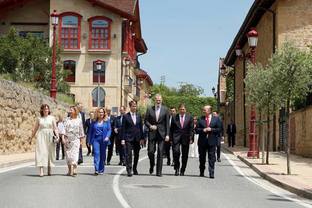 Posteriormente, la celebración continuó en las Bodegas Marqués de Riscal, en Elciego. Este fue el lugar elegido para el acto institucional principal, al que acudieron también el ministro de Agricultura, Luis Planas, y los presidentes de las tres comunidades autónomas que comparten territorio con la Denominación: La Rioja, el País Vasco y Navarra. Gonzalo Capellán, Imanol Pradales y María Chivite participaron junto al monarca en la recepción oficial y acompañaron a la comitiva durante el recorrido por las instalaciones.