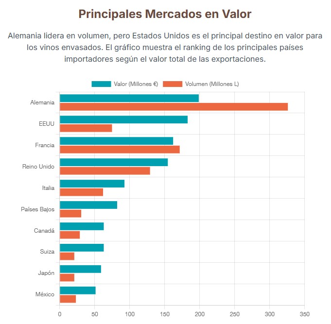 Por destinos, Alemania continúa como el principal mercado para el vino español en volumen y uno de los primeros en valor, con 198,6 millones de euros y 325,9 millones de litros. Estados Unidos se sitúa como primer destino en valor para los vinos envasados y segundo en términos generales, con 182,7 millones de euros y 74,7 millones de litros. Francia se mantiene como tercer destino en valor, con 162 millones de euros y 171,4 millones de litros. Reino Unido ocupa la cuarta posición, con 154,4 millones de euros y 129 millones de litros. Italia figura en la quinta plaza, con 92,5 millones de euros y 61,9 millones de litros. Entre los destinos extracomunitarios, Canadá alcanzó 62,9 millones de euros y 28,7 millones de litros, México sumó 51,2 millones de euros y 23,1 millones de litros y Japón llegó a 59 millones de euros y 20,8 millones de litros. Otros mercados relevantes fueron Países Bajos con 82 millones de euros y 30,7 millones de litros, Suiza con 62,9 millones de euros y 20,8 millones de litros, y Polonia con 36,2 millones de euros y 10,2 millones de litros.