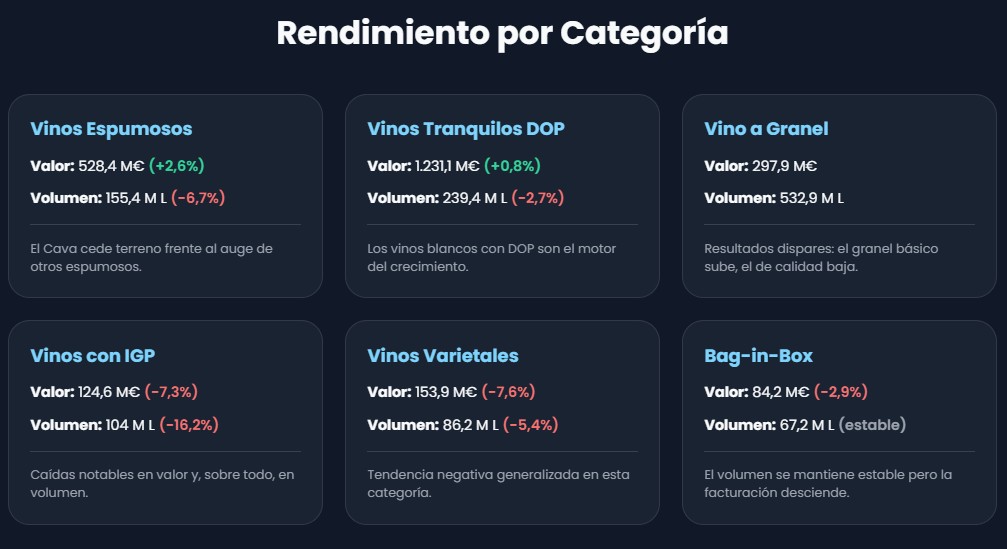 Por categorías, los vinos espumosos sumaron 528,4 millones de euros, con un incremento del 2,6%, y 155,4 millones de litros, un 6,7% menos. Dentro de este grupo, el cava continúa siendo el producto más representativo aunque experimentó retrocesos. Alcanzó 391,1 millones de euros en valor, un 4,1% menos, y 105,8 millones de litros, con una caída del 18,2%. El resto de espumosos siguió una evolución contraria y se situó en 137,2 millones de euros, un 27,9% más, con un volumen de 49,6 millones de litros, un crecimiento del 33,7%.