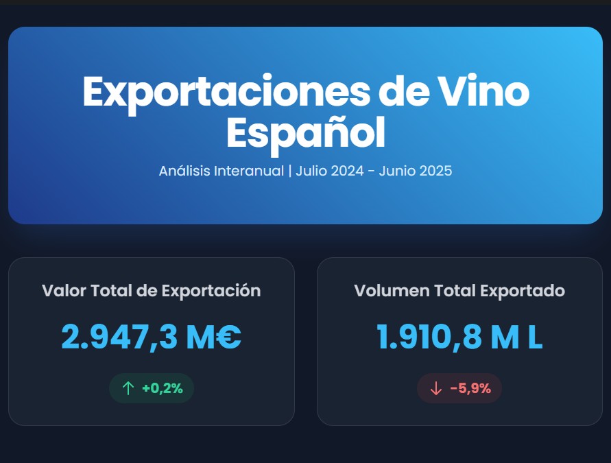 Las exportaciones españolas de vino cerraron el periodo interanual comprendido entre julio de 2024 y junio de 2025 con un ligero aumento en valor y un descenso en volumen. Según los datos de la Agencia Tributaria analizados por la Organización Interprofesional del Vino de España, las ventas exteriores alcanzaron los últimos doce meses los 2.947,3 millones de euros, lo que supone un crecimiento del 0,2% respecto al mismo periodo del año anterior, mientras que el volumen se redujo un 5,9%, hasta los 1.910,8 millones de litros. En términos absolutos se facturaron 5,9 millones de euros más pero se dejaron de exportar 118,8 millones de litros.