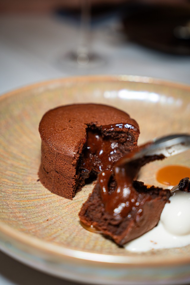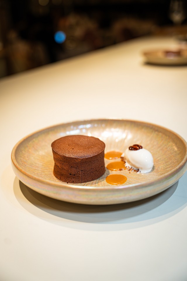 La calidad del chocolate —un blend con 72% de cacao, equilibrado y con notas amargas y frutales— es clave en esta creación, que se presenta con un punto exacto de cocción y una elaboración impecable. El acompañamiento de nueces pecanas caramelizadas al estilo cantonés y el helado caramel crunch aportan matices exóticos y un contrapunto textural que hacen de este postre una experiencia completa.