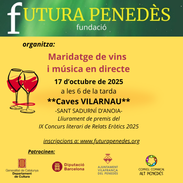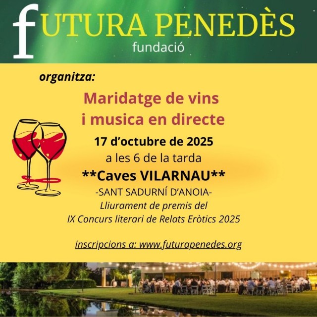 El próximo viernes, 17 de octubre de 2025, tendrá lugar en las Caves Vilarnau el acto de entrega de premios del IX Concurso de Relatos Eróticos con DO, organizado por la Fundación Privada Futura Penedès, con el patrocinio del Consell Comarcal de l'Alt Penedès, el Ajuntament de Vilafranca del Penedès, la Diputació de Barcelona, Tastavins, Euroselecció, el Departament de Cultura de la Generalitat de Catalunya y el Restaurant NEM (Sitges), con la colaboración de la DO Penedès, Incavi, Masia Torre del Gall, JBD so i il·luminació, la Escola Artèria y Fusteria Carpen.