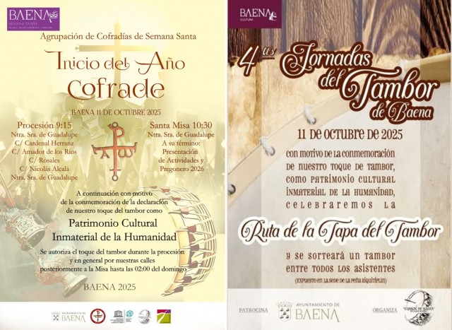 ¿A qué suena Baena? La respuesta es a tambor. Su sonido, declarado Patrimonio Inmaterial de la Humanidad por la UNESCO, es un orgullo para los baenenses y sus hermandades. El próximo 11 de octubre dará inicio de forma oficial el año cofrade, de la mano de la Agrupación de Cofradías de Semana Santa. Tendrá lugar una solemne procesión a partir de las 09:15, que comienza y acaba en Nuestra Señora de Guadalupe, pasando por Cardenal Herranz, Amador de los Ríos, Rosales y Nicolés Alcalá con el Crismón de Baena, el símbolo que une a todos los baenenses. Posteriormente, en Ntra. Sra de Guadalupe, a las 10:30, se celebrará una Misa, seguida de la presentación de las actividades programadas por la Agrupación y se presentará al pregonero de 2026.