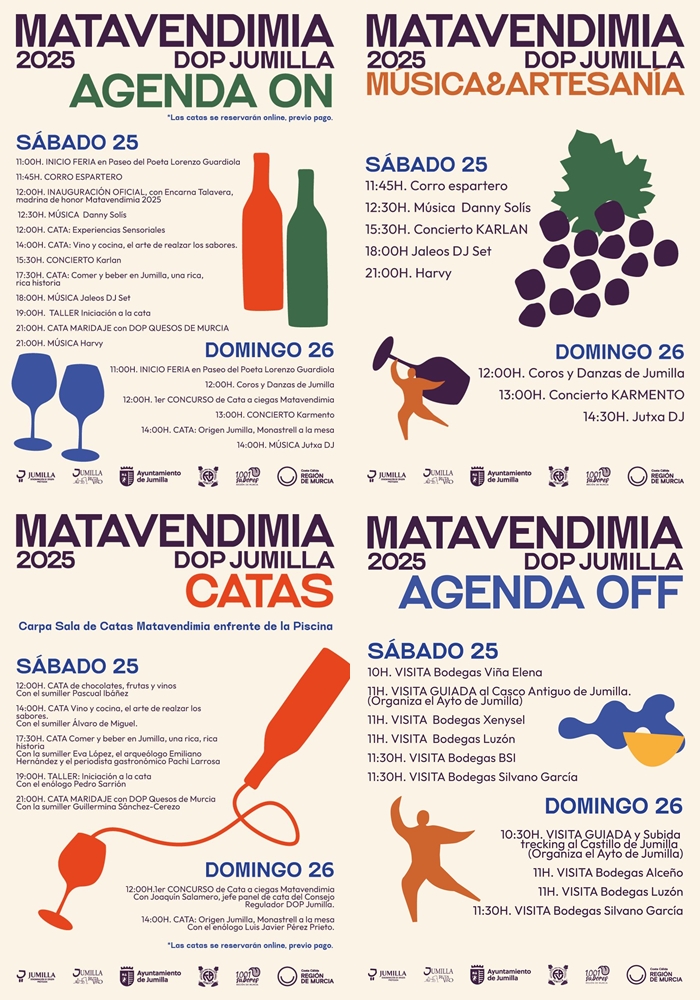 La cuarta edición de la feria Matavendimia, dedicada al vino y al enoturismo de la Denominación de Origen Protegida Jumilla, comenzará este sábado, 25 de octubre, en el Paseo del Poeta Lorenzo Guardiola, en el centro de Jumilla. La inauguración está prevista para las 12 de la mañana y contará con la presencia de la consejera de Agricultura de la Región de Murcia, autoridades locales y el presidente del Consejo Regulador DOP Jumilla, Silvano García. Encarna Talavera ejercerá como madrina del evento.