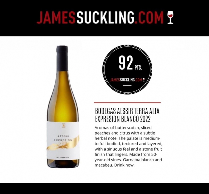Bodegas Aessir, una empresa familiar con presencia en tres zonas vinícolas de España, ha recibido los primeros 92 puntos de James Suckling para uno de sus vinos. El crítico internacional ha publicado la valoración del Aessir Expresion Blanco 2022, de la Denominación de Origen Terra Alta. Según la nota de cata, el vino presenta aromas de caramelo, melocotón en rodajas y cítricos, junto a una sutil nota herbal. En boca, Suckling lo describe como un vino de cuerpo medio a completo, con textura y capas, sensación sinuosa y un final persistente de fruta de hueso. Este blanco se elabora con viñas de 50 años de Garnatxa blanca y Macabeu.