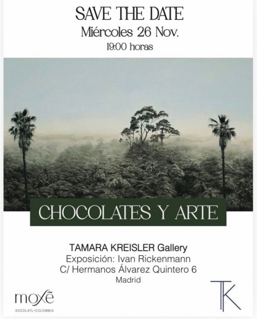 La exposición "SELVA NEGRA" del artista colombiano Iván Rickenmann en Tamara Kreisler Gallery en C/ Hermanos Álvarez Quintero, 6, en Madrid centro convierte el espacio en una experiencia multisensorial donde la obra gráfica inspirada en la densidad y memoria de la selva tropical se une a una cata de cava y chocolate Moxẽ elaborados con cacao colombiano bean-to-bar y permanece abierta del 23 de octubre al 29 de noviembre de 2025.