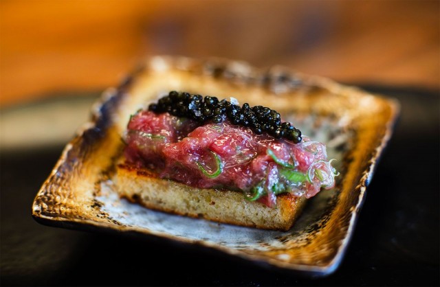 El segundo acto, otsukuri, pone el acento en el corte y el equilibrio. El ya icónico Pa amb Tomaquet de ventresca, el Gyutataki —lomo bajo apenas marcado con ponzu, ajo confitado y cebolleta fresca— y el tartar de aguacate picante conforman un trío que alterna profundidad, acidez y notas vegetales sin perder precisión. Es, probablemente, el bloque más reconocible del lenguaje Kabuki.