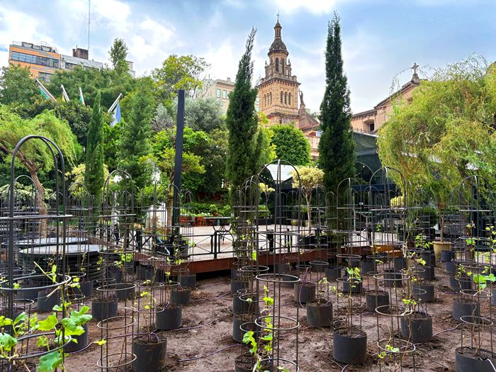 En principio empezamos con 150 plantas. El hotel tiene dos plazas en la parte de atrás que son bastante grandes, similares en tamaño a lo que es Montmartre en París. Así que la idea es seguir plantando en esos espacios ya que la experiencia actual está funcionando muy bien así que probablemente el año que viene veamos la posibilidad de ir extendiendo el viñedo para ese lado que tiene salida directa a la calle Tacuarí. Está bueno porque la gente podría entrar al proyecto también por ese lado.