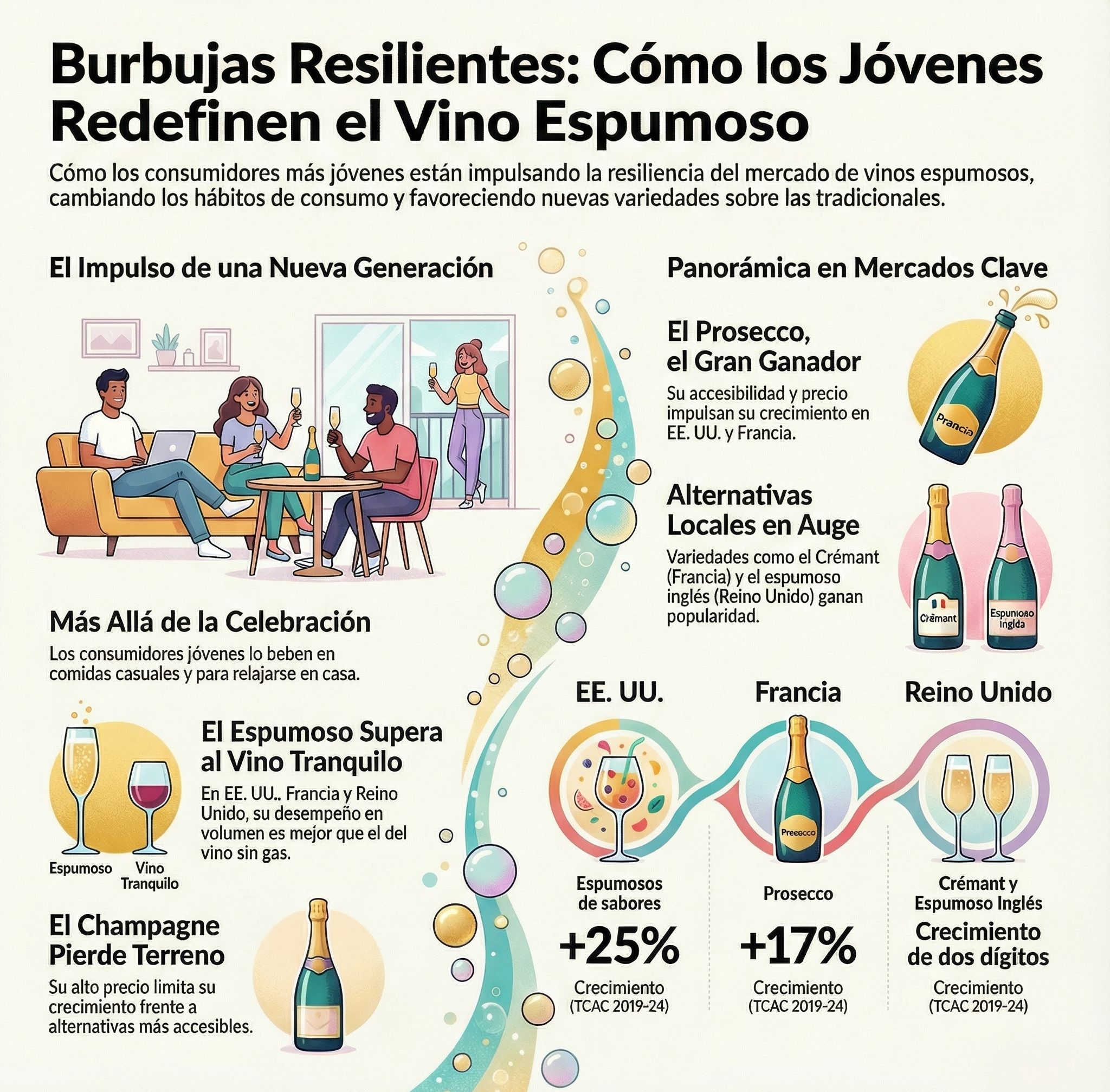 El sector del vino espumoso mantiene su posición en los principales mercados internacionales, a pesar de las dificultades que atraviesa la industria vinícola. Según los informes Sparkling Wine Landscape publicados por IWSR para Francia, Reino Unido y Estados Unidos, el vino espumoso ha logrado resistir mejor que el vino tranquilo durante 2024. Aunque los volúmenes de venta han registrado ligeros descensos en estos tres países, la categoría se mantiene firme gracias al interés de los consumidores más jóvenes y a su integración en situaciones cotidianas, más allá de las celebraciones tradicionales.