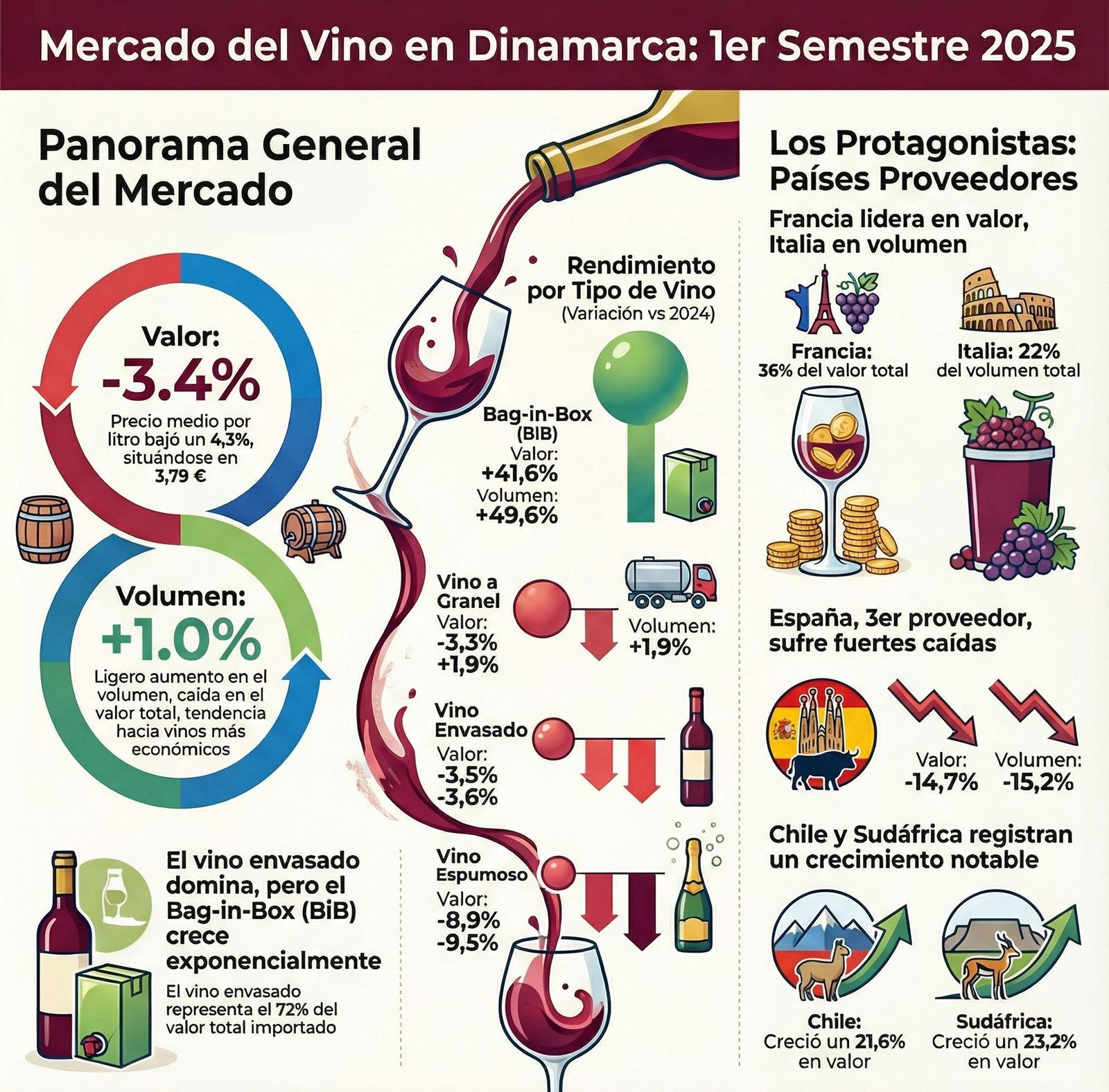 En resumen numérico para el primer semestre: Dinamarca importó vino por valor de 343,7 millones de euros y un volumen total de 90,7 millones de litros. El mercado muestra una tendencia hacia la búsqueda de precios más bajos y formatos alternativos como el Bag-in-Box. Francia e Italia mantienen posiciones preferentes como proveedores principales mientras que España pierde peso relativo. Países como Chile o Sudáfrica aprovechan para ganar cuota gracias a su crecimiento sostenido.