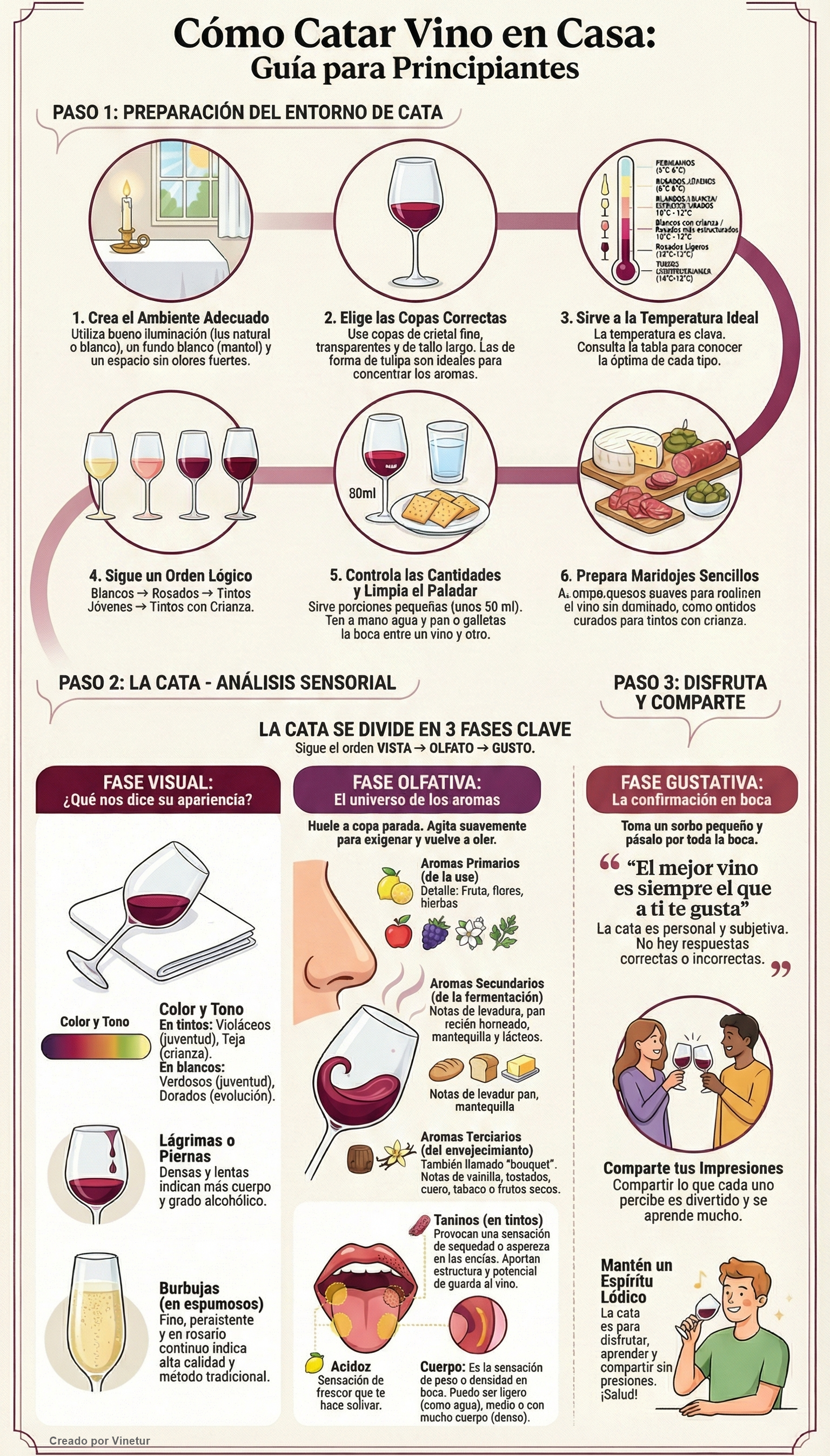 El primer paso consiste en preparar el espacio. Es recomendable elegir un lugar bien iluminado, preferiblemente con luz natural o blanca neutra, y disponer de un fondo blanco, como un mantel o una hoja de papel, para observar mejor el color del vino. El ambiente debe estar libre de olores intensos, como los de comida, humo o perfumes, ya que pueden interferir en la percepción de los aromas. Se aconseja mantener el entorno tranquilo y relajado.