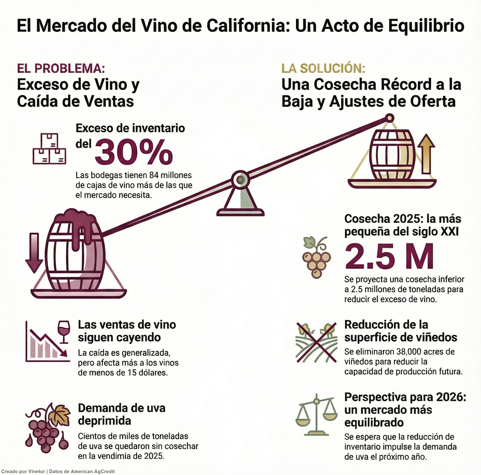 Para corregir este desequilibrio, el sector está recurriendo principalmente a una reducción en la producción. La cosecha californiana de 2025 se prevé como la más pequeña del siglo XXI, con menos de 2,5 millones de toneladas recolectadas frente a las más de 4 millones habituales durante los años centrales de la pasada década. Esta reducción responde tanto a factores climáticos como a la eliminación masiva de viñedos: entre octubre del año pasado y agosto se han arrancado unas 38.000 hectáreas, lo que representa una disminución del 7,5% del viñedo total.