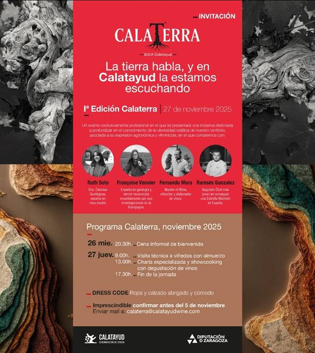 Este primera edición de Calaterra ha supuesto un punto de partida, un comienzo para este proyecto que este consiste en el estudio que establecerá los suelos tipo que permitan identificar y seleccionar las parcelas y viñedos que mejor expresan sus características y con ello la identidad de los vinos de la DOP Calatayud. En Calaterra el protagonista es el suelo y su sostenibilidad en el futuro siendo este el hilo conductor de este interesante encuentro. Conocer su pasado geológico, como han evolucionado sus suelos con el tiempo y así poder proyectar un futuro sostenible.