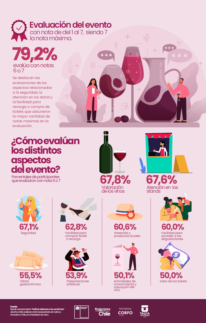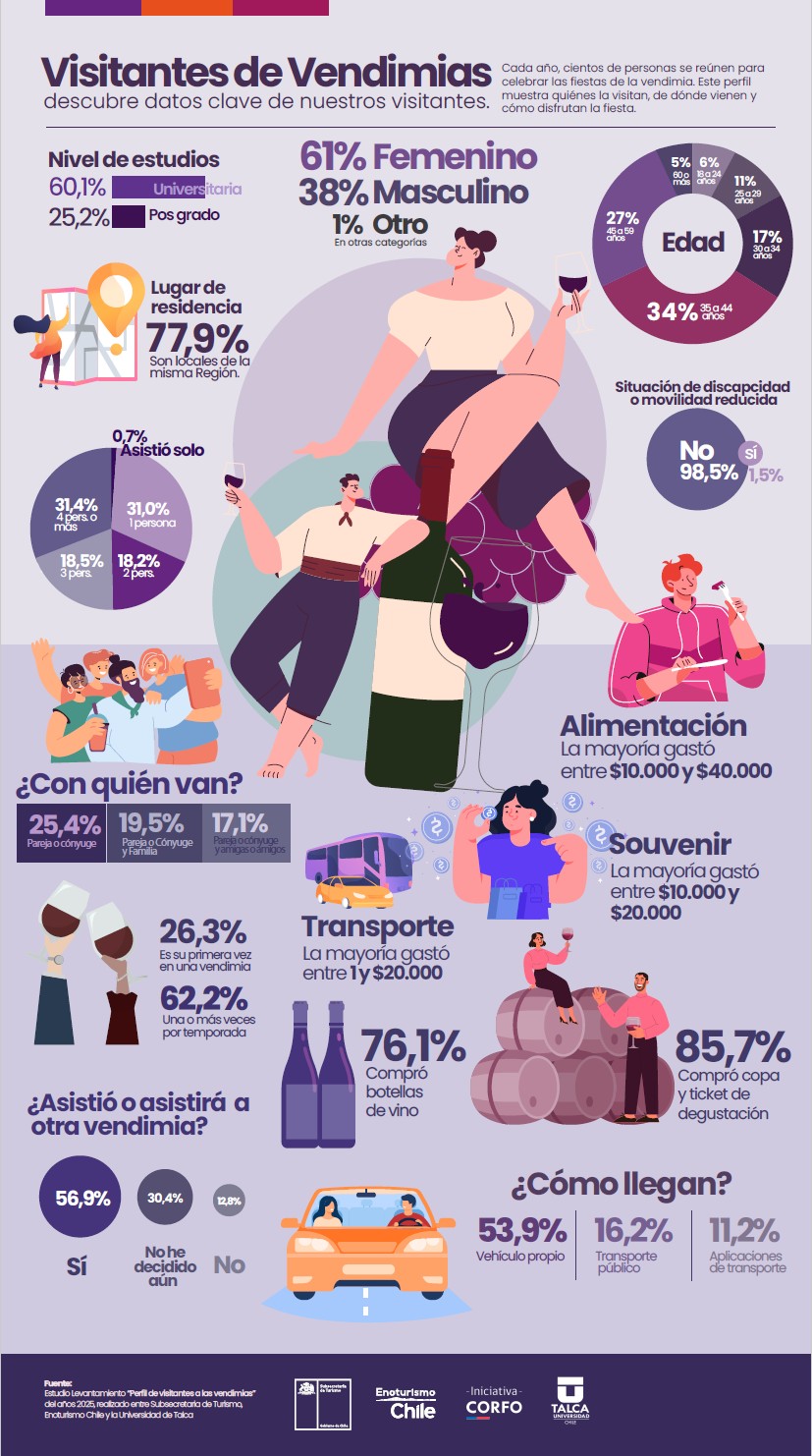Como parte del evento se presentó una infografía sobre el perfil del visitante a las Fiestas de la Vendimia. El estudio fue elaborado por Enoturismo Chile junto a la Subsecretaría de Turismo y la Universidad de Talca. Los datos provienen de encuestas realizadas en diez vendimias oficiales durante este año. El informe indica que más de 1,4 millones de personas asistieron a estas fiestas en 2025. La mayoría son visitantes nacionales, con alta presencia femenina y predominio de grupos familiares o amigos. El estudio muestra también una fuerte disposición al consumo local mediante la compra de entradas, copas para degustación y vinos producidos en cada territorio. Los niveles generales de satisfacción son altos.