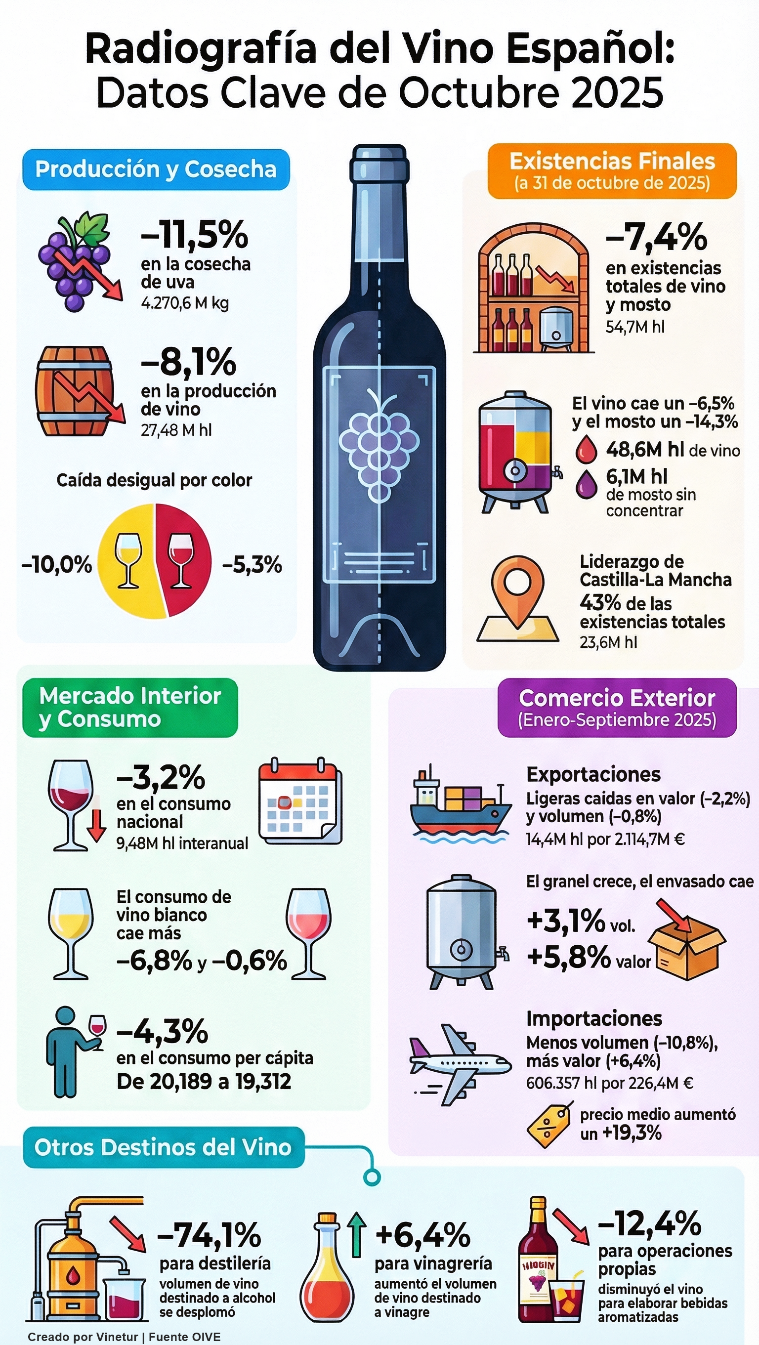 En cuanto a la producción de uva, también se observa una bajada importante. En los tres primeros meses de la campaña actual se han recogido 4.270,6 millones de kilos, un 11,5% menos que en el mismo periodo del año anterior. Esta caída en la entrada de uva es más acusada que la reducción final en vino, lo que puede indicar ajustes en los rendimientos o una mayor rotación de existencias intermedias.