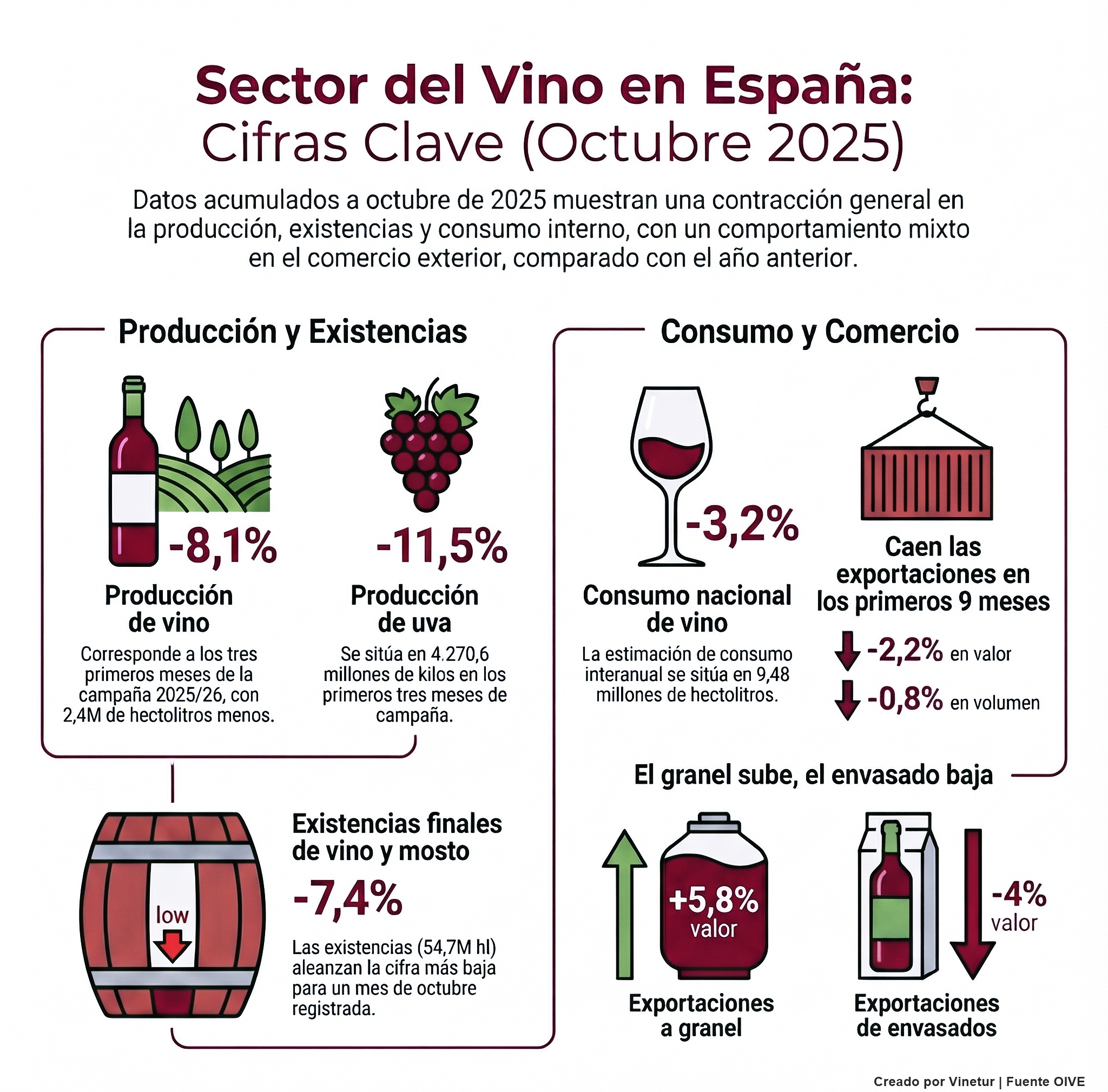En el comercio exterior se observa una paradoja: aunque las exportaciones aumentan puntualmente al inicio de campaña por la demanda internacional tras una vendimia corta europea generalizada, el valor total exportado cae debido al peso creciente del granel frente al vino embotellado. Esta tendencia puede afectar negativamente al posicionamiento internacional del vino español si no se recupera el valor añadido.