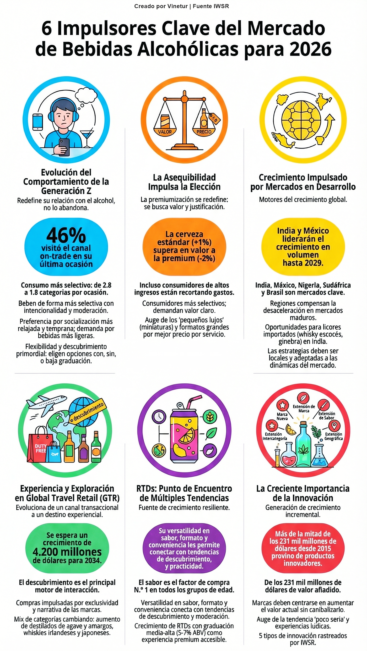 El sector de las bebidas alcohólicas afronta un periodo de cambios marcados por la evolución de los hábitos de consumo, la presión sobre el poder adquisitivo y la búsqueda de nuevas oportunidades en mercados y canales. Según el último informe de IWSR, seis factores principales influirán en el desarrollo del sector durante los próximos años.