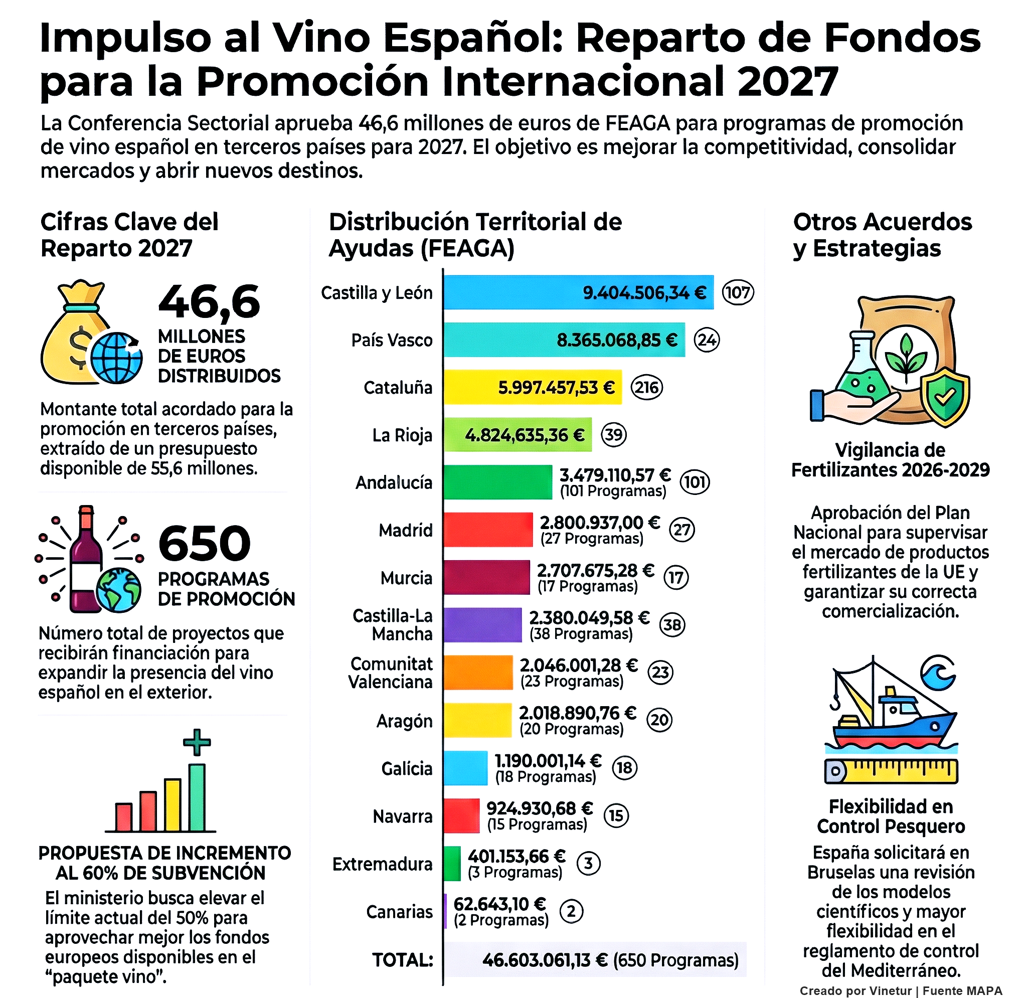 El ministro Luis Planas ha explicado que los programas financiados permiten dar a conocer las características y cualidades del vino español fuera del territorio comunitario. Según el Ministerio, esta estrategia contribuye a mejorar la competitividad del sector vitivinícola nacional y a consolidar su presencia en mercados internacionales.