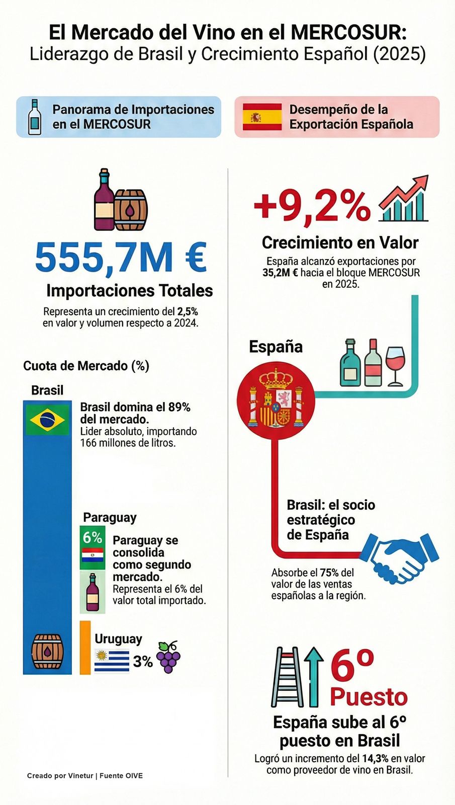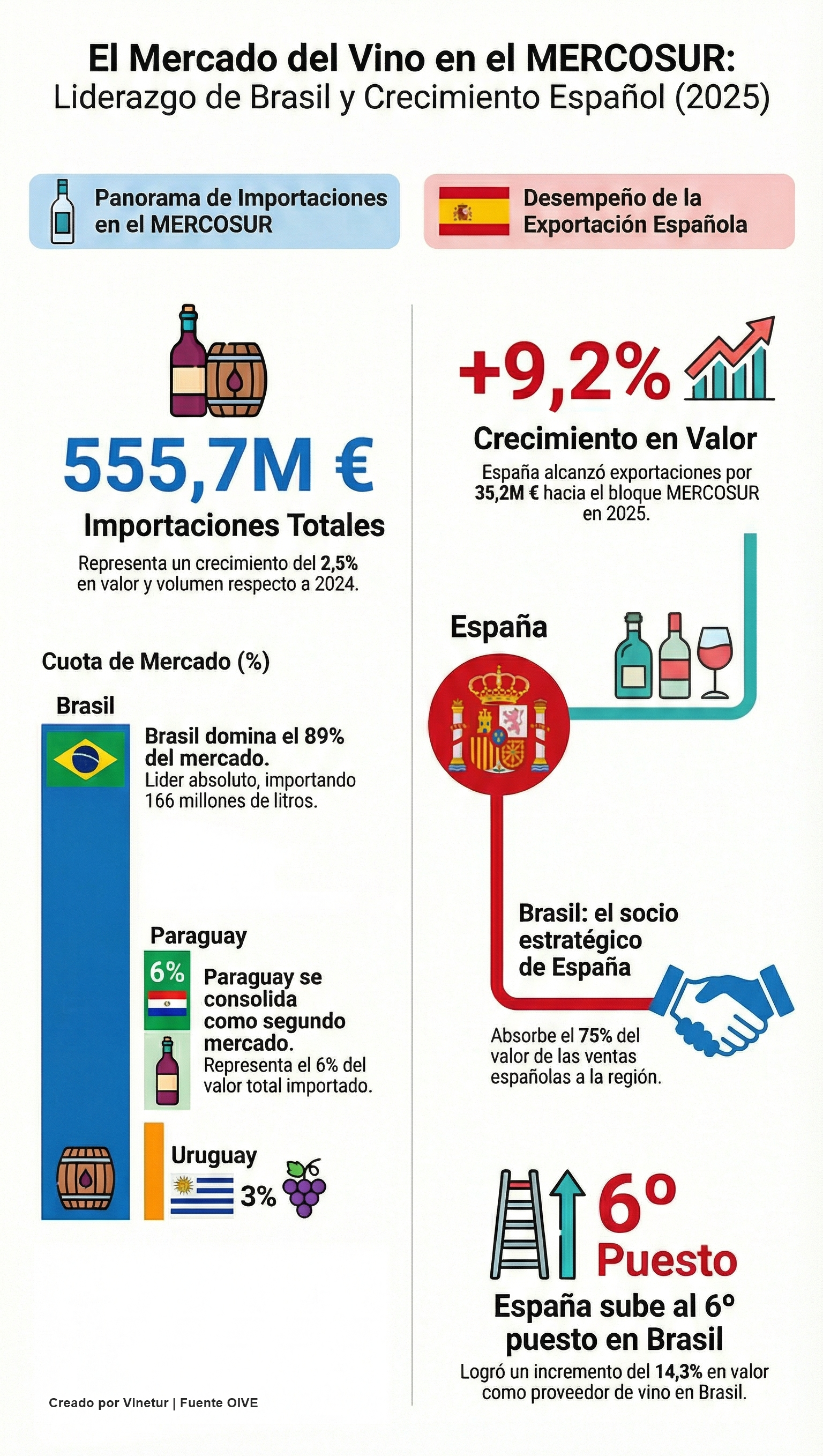Las importaciones de vino en los países que forman MERCOSUR, es decir, Brasil, Paraguay, Uruguay y Argentina, alcanzaron los 187,2 millones de litros entre diciembre de 2024 y noviembre de 2025. El valor total de estas compras fue de 555,7 millones de euros. Estos datos, analizados por la Interprofesional del Vino de España (OIVE) a partir de cifras oficiales de cada país, muestran un aumento del 2,5% tanto en volumen como en valor respecto al mismo periodo del año anterior. El precio medio pagado por litro se situó en 2,97 euros, una cifra que se mantiene estable respecto a los datos del año anterior.
