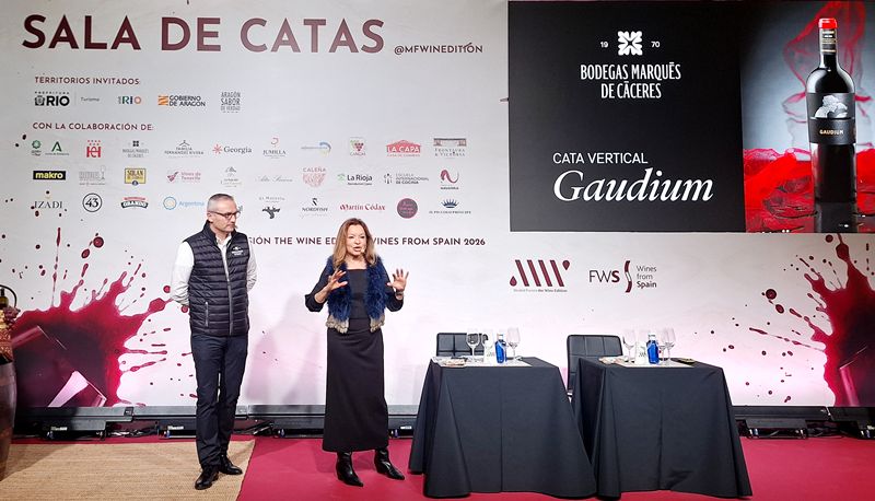 La presentación dirigida por Cristina Forner, Presidenta de Bodegas Marqués de Cáceres, y Fernando Costa, Enólogo en Bodegas Marqués de Cáceres, nos acerca a esta icónica elaboración de la bodega riojana de Marqués de Cáceres en la que además conocer su evolución, no sólo en la parte líquida, sino también en la parte histórica que acompaña a este emblemático vino. Los inicios de Marqués de Cáceres como bodega se remontan al año 1970 adquiriendo rápidamente el reconocimiento, tanto en el ámbito nacional como en el internacional. Sin embargo, los orígenes de Gaudium se remontan al año 1994 como una apuesta de la bodega por elaborar un vino de la más alta expresión, de calidad y artesanal. Para ello no escatiman en recursos; selección de parcelas y de uva, en este caso de la variedad Tempranillo, vendimia manual y aplicando las más recientes técnicas de elaboración que han ido evolucionando con el paso de los años, veinte concretamente. Un tiempo este en el que la evolución ha sido constante pero en el que la filosofía ha sido la misma. Un vino de esmerada elaboración desde el campo, su origen, hasta la bodega.