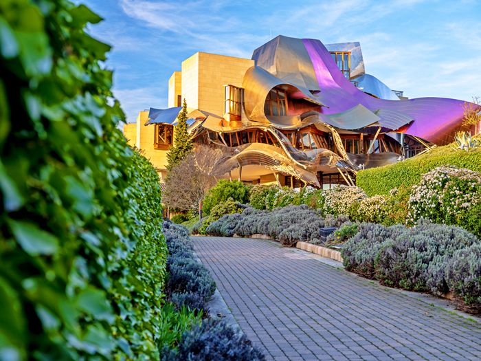 El Hotel Marqués de Riscal, diseñado por el arquitecto Frank O. Gehry, fallecido el pasado mes de diciembre, es uno de los elementos más reconocibles del complejo. Su estructura futurista, con láminas de titanio y acero, alberga los restaurantes Marqués de Riscal y 1860 Tradición, ambos bajo la asesoría del chef riojano Francis Paniego. El primero fusiona la cocina tradicional con propuestas más actuales, mientras que el segundo se centra en recetas clásicas de la zona.