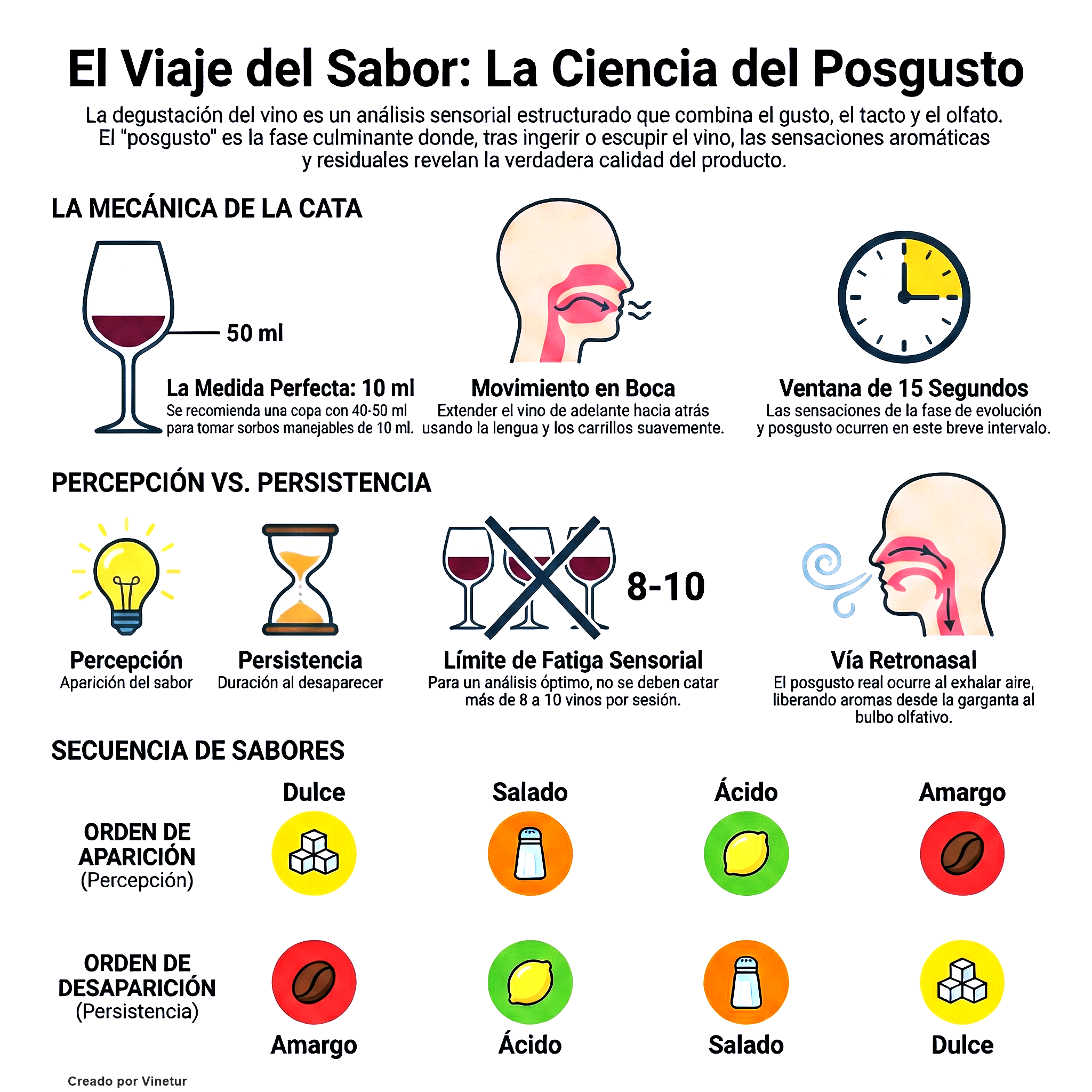La percepción del sabor se divide en varias etapas. La "entrada" o "ataque" del vino es el primer contacto, donde predominan los sabores dulces y ácidos. Después llega la "evolución", en la que se perciben los matices salados y amargos. Finalmente, aparece el "posgusto" o "retrogusto", una fase en la que surgen sensaciones pseudotáctiles y aromáticas indirectas, que pueden durar entre 10 y 15 segundos. Tras tragar o escupir el vino, se produce el posgusto, donde suelen predominar las sensaciones aromáticas, aunque en ocasiones pueden aparecer también sabores residuales.