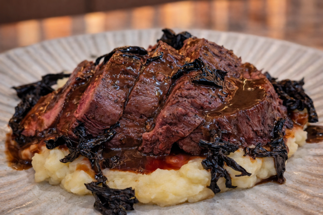 Los amantes de la carne y del buen producto también encuentran aquí un plato a la altura con el Solomillo, quizá el pase más completo y mejor definido del conjunto. La carne llega en un punto de cocción impecable, especialmente tierna y bien trabajada. La trompeta de la muerte, una seta de perfil profundo y ligeramente terroso, aporta interés y personalidad al plato, en diálogo con un acompañamiento más clásico de puré de patata y una salsa casera bien ligada, responsables de cerrar el conjunto con equilibrio y armonía.