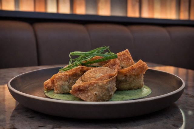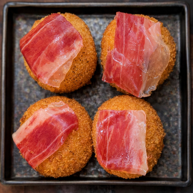 Comenzamos con un clásico: Croquetas casera de jamón ibérico. De tamaño generoso y cubierta por una lámina exterior muy fina, presenta un rebozado limpio y bien resuelto, sin exceso de grasa. En el interior, la bechamel resulta especialmente cremosa y sostenida, con un sabor nítido a jamón ibérico que domina el conjunto con claridad y persistencia. El primer toque personal llega con los Saquitos de ropa vieja bajo una salsa verde. La cobertura, más crujiente, aporta contraste y se agradece desde el primer bocado. En el interior, el relleno ofrece un sabor intenso y profundo, con la potencia propia de los guisos trabajados a fuego lento durante horas.