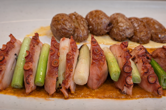 Madrid no tiene mar, pero el pescado llega siempre fresco. Buena prueba de ello es el Pulpo al grill, servido en brocheta, con un guiño lúdico que remite de forma sutil a la idea de producto recién pescado. El punto de cocción resulta especialmente preciso, firme y jugoso, algo nada fácil de conseguir. El plato se completa con cebollino, una base de mojo rojo y patatas baby acompañadas de salsa de pimiento amarillo; aportan matices y acompañan al producto sin restarle protagonismo.