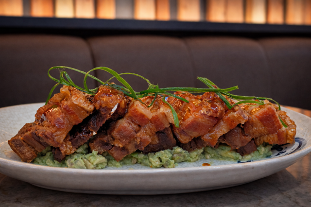 Otro de los platos recomendables son los Calamares, aderezados con ajo negro y acompañados de una mayonesa cítrica. De nuevo, la fritura resulta fina y bien ejecutada, ligera en boca y sin rastro de grasa. Un plato sencillo en apariencia, pero que siempre funciona. Para cerrar este primer tramo por todo lo alto, los Torreznos con base de guacamole resultan imprescindibles. El corte es limpio, la corteza cruje con rotundidad y el interior mantiene un punto jugoso bien controlado. El guacamole introduce un guiño claramente mexicano, perceptible también en la estética y en algunas salsas —como el chipotle servido para acompañar con pan—, que aportan frescor, matiz ahumado y un contrapunto bien medido a un bocado intenso y reconocible.