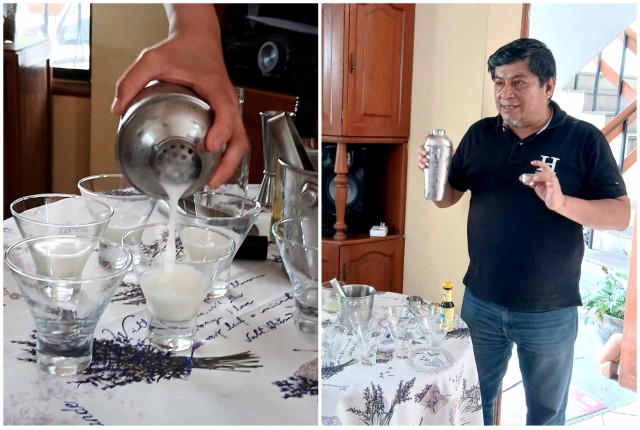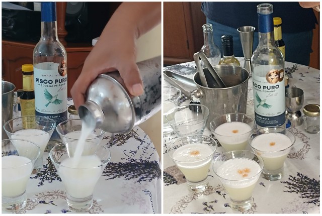 Luego llegó el momento central de la celebración: preparamos la versión más difundida del Pisco Sour utilizando la proporción 3–1–1. Se explicó la función de cada ingrediente, la importancia del equilibrio y la técnica de batido para lograr una espuma firme y estable.