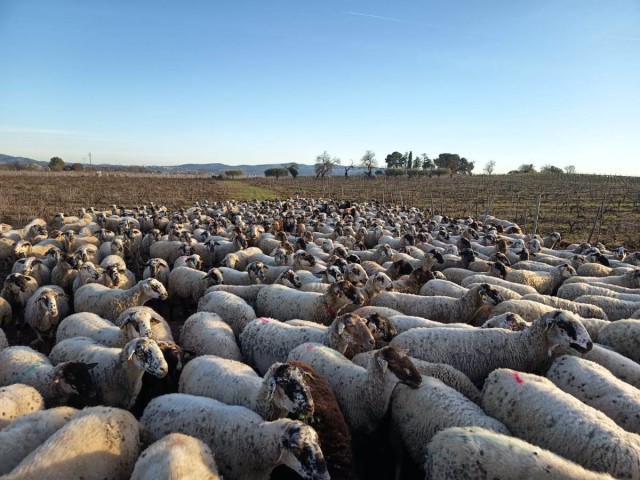 Durante los meses de invierno, un rebaño de sesenta ovejas pasta entre las cepas de la bodega. Esta práctica tradicional permite controlar de forma natural la cubierta vegetal, reducir el uso de maquinaria agrícola y aportar fertilización orgánica al suelo mediante el estiércol de los animales. El resultado es una mejora de la estructura del suelo, un aumento de la biodiversidad y una viña preparada en óptimas condiciones para la nueva temporada. Un modelo que integra ganadería y viticultura dentro de un mismo sistema agrícola sostenible.