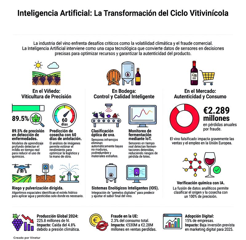 La inteligencia artificial (IA) está ganando presencia en el sector vitivinícola, desde la gestión de los viñedos hasta la relación con el consumidor final. El uso de IA se apoya en una combinación de sensores, infraestructuras de datos, modelos de aprendizaje automático y flujos de trabajo para la toma de decisiones. Este conjunto de herramientas se aplica a lo largo de toda la cadena de valor, comenzando en el viñedo y terminando en la confianza del consumidor y las compras repetidas.