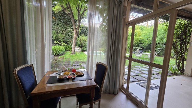 Uno de los grandes diferenciales del hotel es su jardín interno, un verdadero oasis urbano. Verde, silencioso y cuidadosamente mantenido, se convierte en el lugar ideal para leer, tomar un café o simplemente desconectarse del ritmo porteño. Es ese tipo de espacio que sorprende, porque no se espera encontrar tanta calma en pleno Palermo.