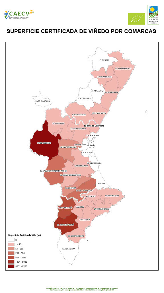 Los datos reflejan además un aumento de superficie respecto al ejercicio anterior, con 530 hectáreas más inscritas. En cuanto al número de bodegas certificadas, se mantienen las cifras, con 53 elaboradores que cuentan con el aval del CAECV para producir y embotellar vinos ecológicos.