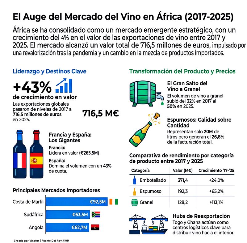Las exportaciones mundiales de vino hacia África han experimentado un crecimiento importante en los últimos ocho años, según datos oficiales de aduanas analizados por Del Rey AWM. Entre 2017 y el periodo de doce meses finalizado en octubre de 2025, el valor de las exportaciones aumentó un 43%, mientras que el volumen creció un 21%. Estas cifras han sido ajustadas por Del Rey AWM para corregir inconsistencias en los datos oficiales y tener en cuenta las reexportaciones desde Togo y Ghana. El aumento del valor se atribuye principalmente a la revalorización del vino tras la pandemia de COVID-19.