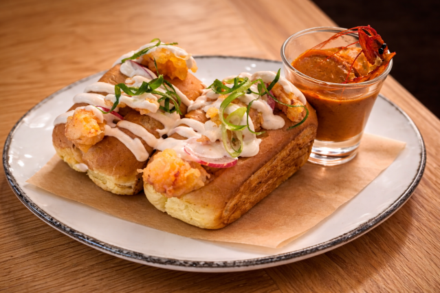 Uno de los platos más sólidos del recorrido es el Rock and Roll de carabinero. Montaje complejo y visualmente potente. Brioche de mantequilla suave y ligeramente tostado que sostiene un carabinero de gran calidad, protagonista por intensidad y textura. La salsa cremosa añade untuosidad y la habanera introduce un picante progresivo, quizá algo elevado para algunos paladares. El bisqué, servido aparte, concentra profundidad y refuerza el carácter marino. Pase ambicioso y bien ejecutado. Para acompañarlo, el Viña Bosquera blanco, ecológico de Madrid, aporta acidez marcada y perfil fresco. Corta la grasa del brioche, sostiene el picante y mantiene la boca despierta.