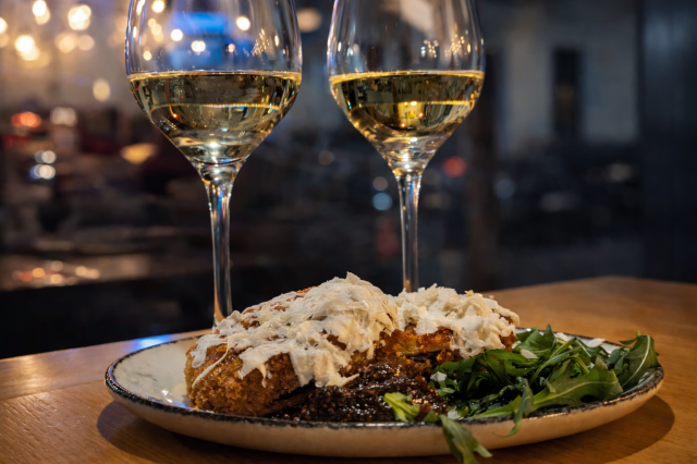 Ningún recorrido está completo sin su final dulce. La Torrija de brioche de coco, de exterior bien caramelizado y tono ámbar intenso, mantiene un interior jugoso y bien empapado. Las especias construyen un perfil aromático preciso y bien integrado. La crema montada de coco, aireada y con volumen, aligera el dulzor y aporta contraste en textura. Cerramos con la Mini cheesecake con mermelada de higos, un postre que hoy casi genera recelo: la tarta de queso se ha convertido en religión y también ha sufrido desgaste por exceso de versiones. Aquí aparece correcta, con sabor lácteo claro y base proporcionada. Podría ganar un punto más de cremosidad para resultar más memorable, pero cumple. Y qué mejor forma de terminar que con una copa de Arrels Montau de Sadurní Brut Nature Reserva, cuya burbuja fina y carácter seco equilibran el dulzor final y dejan el paladar preparado para la última conversación.