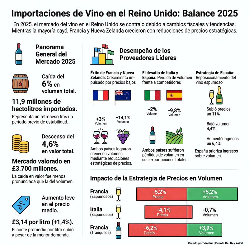 Las importaciones de vino en el Reino Unido experimentaron una caída en 2025, según los datos publicados por el Servicio de Aduanas e Impuestos británico (HM Revenue & Customs) y analizados por Del Rey AWM. El volumen total de vino importado descendió un 6%, situándose en 11,9 millones de hectolitros. En términos de valor, la reducción fue del 4,6%, alcanzando los 3.700 millones de libras esterlinas. Sin embargo, el precio medio por litro subió un 1,4% hasta las 3,14 libras. Este descenso se produce tras un año anterior de estabilidad tanto en volumen como en valor. Entre las causas principales figuran los cambios en la fiscalidad sobre bebidas alcohólicas y nuevas tendencias en el consumo de vino.