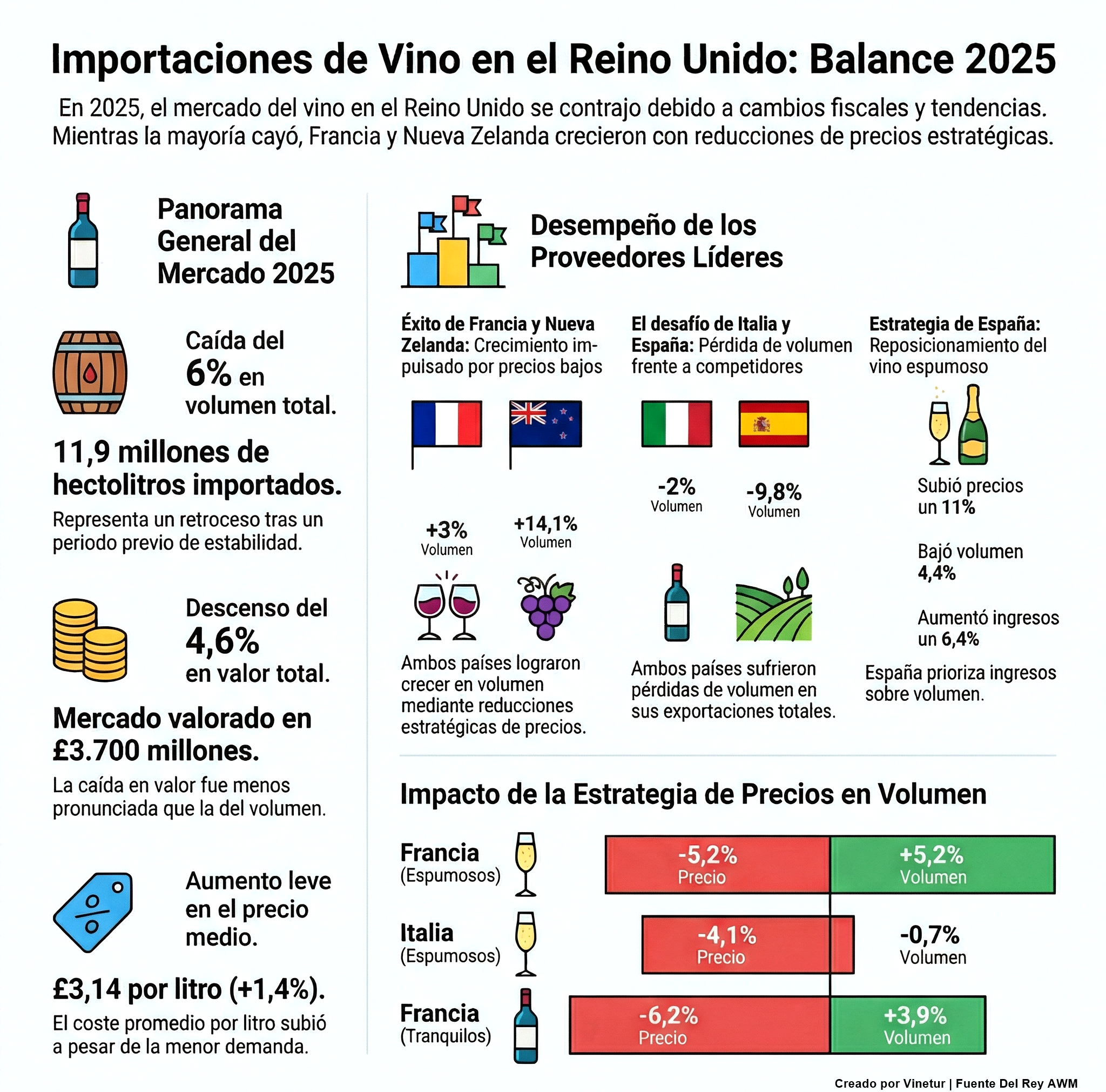 La reducción de precios parece haber sido determinante para el buen comportamiento de Francia y Nueva Zelanda en el mercado británico durante 2025. Francia rebajó el precio medio de sus exportaciones al Reino Unido un 4,7%, situándolo en 7,74 libras por litro. Nueva Zelanda aplicó una bajada aún mayor del 12,5%, hasta las 2,88 libras por litro. Estas rebajas coincidieron con aumentos notables en los volúmenes vendidos: Francia subió un 3% y Nueva Zelanda un 14,1%. Sin embargo, no todos los países lograron mejorar ventas con estrategias similares. Chile, Argentina o Alemania no vieron incrementos pese a bajar precios. Por otro lado, Australia y España subieron sus precios medios y sufrieron caídas en volumen.