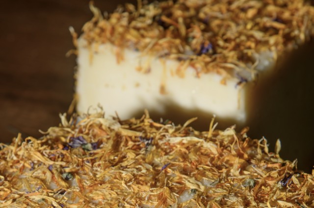 El proceso mantiene una liturgia artesanal: mezcla equilibrada de leche de vaca y oveja, pasteurización a baja temperatura para preservar matices, corte con lira y moldeado manual. La maduración se realiza sobre madera natural de pino, en una cámara que reproduce las condiciones de una cueva, frío y humedad constantes. Cada pieza se voltea a mano hasta alcanzar una textura cremosa y fundente. Antes del envasado, se cubre con pétalos de malva y caléndula, cuya corteza es totalmente comestible y aporta un perfil aromático único.